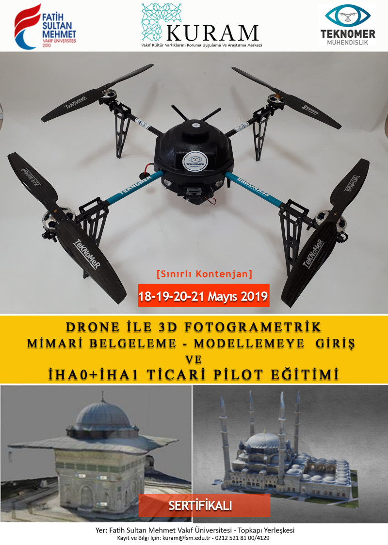 KURAM tarafından 18-19-20-21 Mayıs 2019 tarihlerinde "Drone ile 3D Fotogrametrik Mimari Belgeleme-Modellemeye Giriş ve İHA0+İHA1 Ticari Pilot Eğitimi" @fsmvu Topkapı Yerleşkesi'nde gerçekleşecektir. Sınırlı kontenjanı olan SERTİFİKALI eğitime kayıt için: https://forms.gle/eUPYwh3hKCK4efmKA